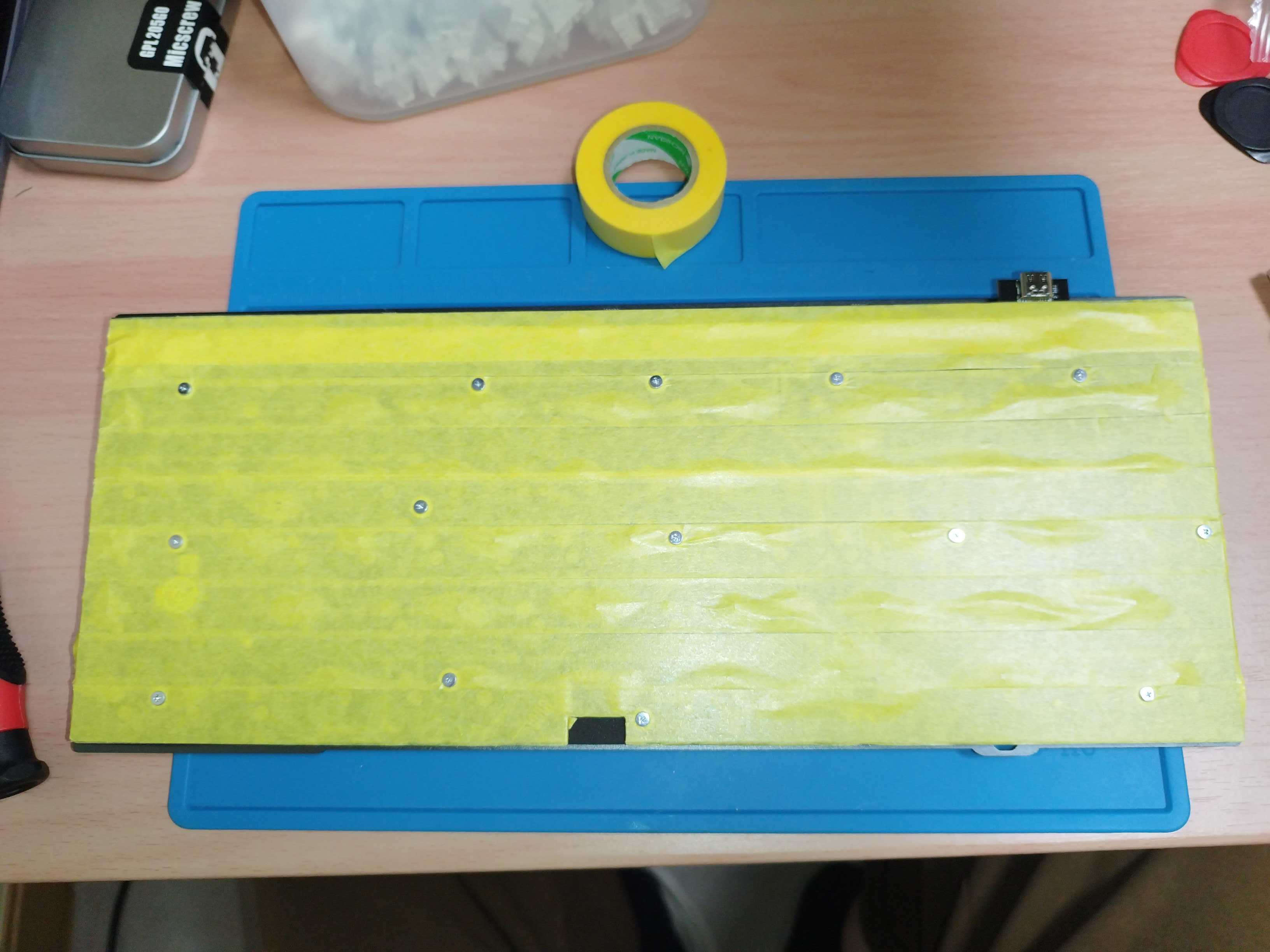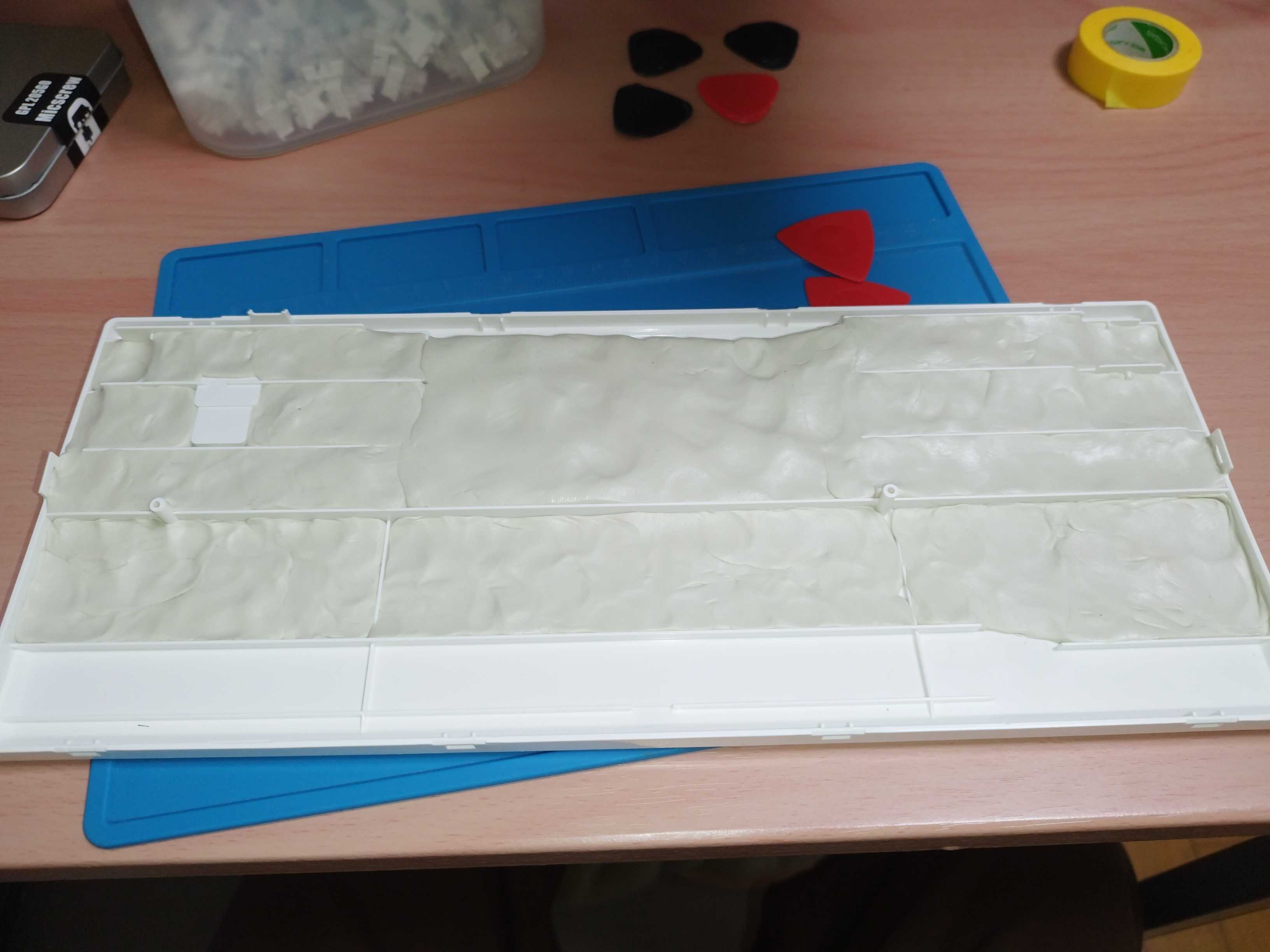 → キーボード内部のPCBの裏面にマスキングテープを貼り付けることによって、キーの押下時の底打ち音を低減させる。比較的簡単なmod。 - clay mod